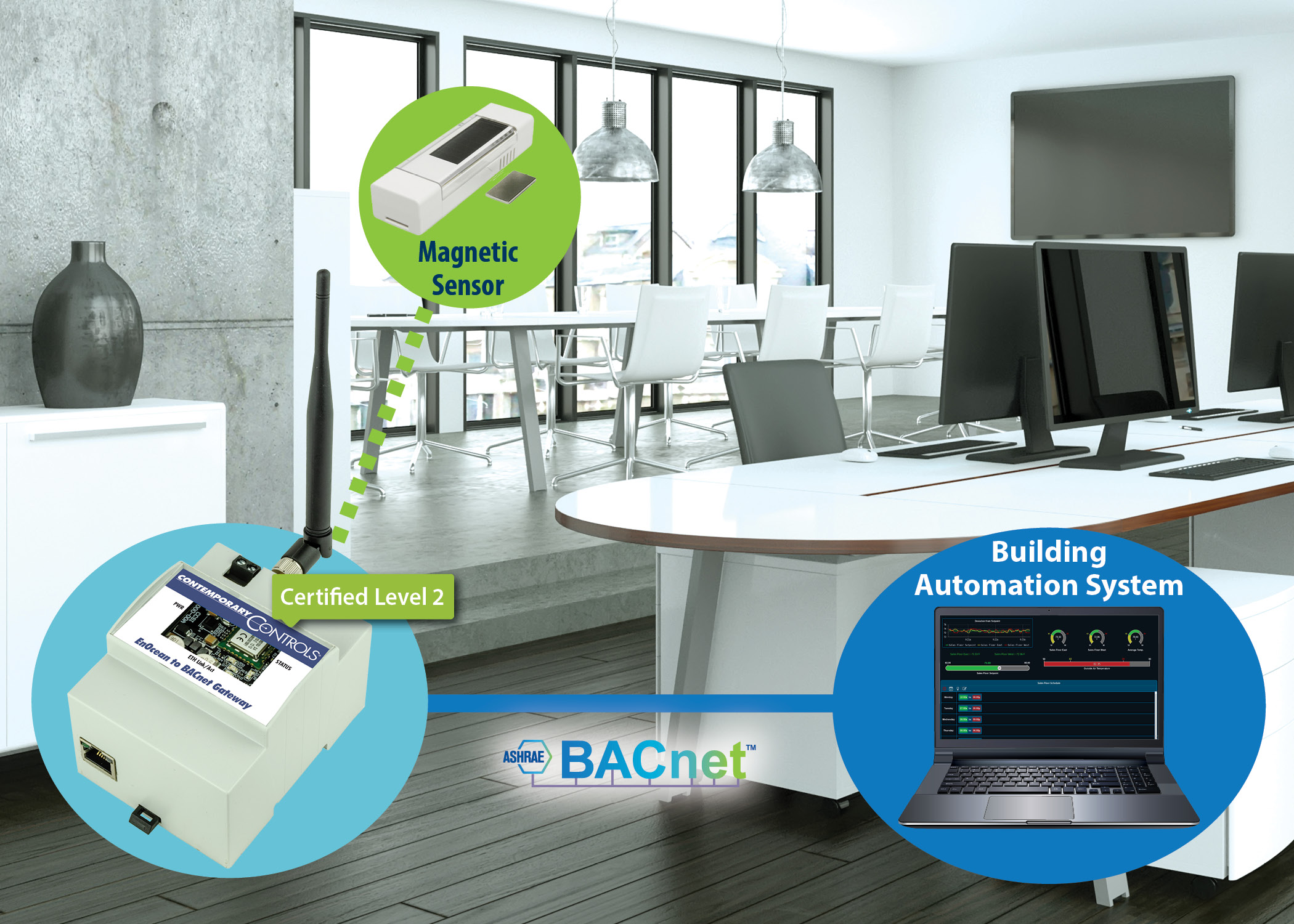 A modern window monitoring system serves as a key component of sustainable building management. By leveraging solar-powered EnOcean sensors and BACnet gateway technology, the window monitoring system provides seamless integration, cost-effective implementation, and maintenance-free operation for both new and retrofit applications, without the constraints of traditional wired systems.