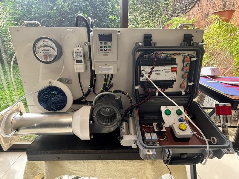 After testing several fan types, Barrantes successfully implemented a centrifugal fan paired with a small duct and a variable louver, capable of simulating a static pressure control loop in the 0–0.5 inches of water column (IWC) range—a common pressure measurement in clean room environments.